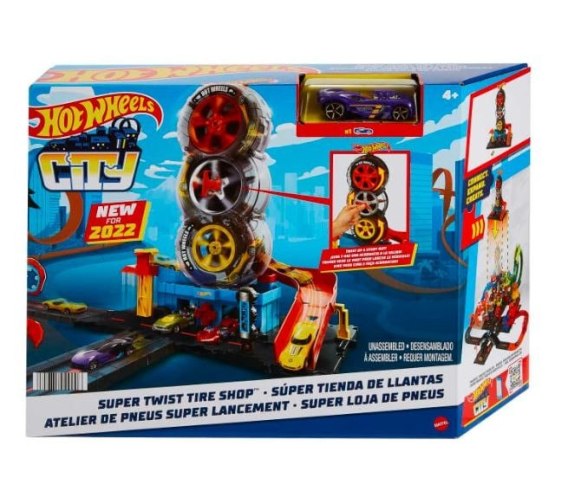 Dzieci mierzą się z wieloma zakrętami w sklepie Hot Wheels City Super Twist Tire Shop, kręcąc środkowym kluczykiem i przejeżdżając swoimi samochodami przez przezroczyste koła sklepu. Gdy dotrą na szczyt, pokonują rampę, by wyruszyć na nowe przygody. Podstawa zestawu łączy się z innymi zestawami Hot Wheels i może być używana z dodatkowymi elementami toru Hot Wheels, dzięki czemu dzieci mogą zbudować świat kaskaderski i wyścigowy według własnego projektu (dodatkowe zestawy i tor są sprzedawane osobno). Jeden samochód Hot Wheels jest wliczony w cenę, ale nawet cztery mogą jednocześnie skręcać się w strukturze opony (dodatkowe samochody sprzedawane osobno). Realistyczne detale, takie jak aktywowana przez dzieci winda, obracający się wyświetlacz opon i dystrybutor paliwa, zwiększają możliwości opowiadania historii. Kolory i dekoracje mogą się różnić.
