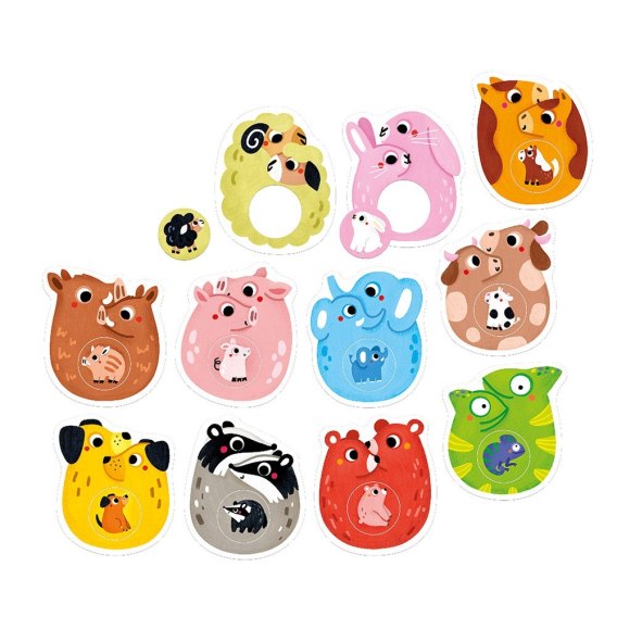 W zestawie znajdziecie 11 dużych dwuelementowych układanek z dokładanymi kółeczkami - należy dopasować je do właściwych dziurek. Urocze ilustracje przedstawiają rodziców i maluchy. Taka zabawa to sposób, aby na wesoło doskonalić sprawność dłoni, bystre oko i wyobraźnię. Puzzle świetnie sprawdzą się jako pierwsze układanki już dla roczniaków.
