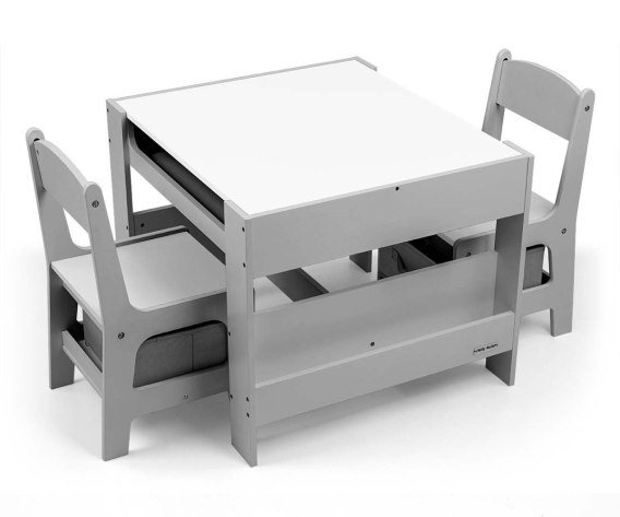 Zestaw wielofunkcyjnych mebli dla dzieci. Stolik SVEN z dwoma krzesełkami utrzymany w kolorystyce bieli i szarości z szarymi akcesoriami, wykonany z myślą o zapewnieniu dzieciom: wygody, przestrzeni do kreatywnej zabawy, malowania, pisania oraz zapewnieniu maksymalnego komfortu podczas zajęć. Zestaw zawiera 2 krzesełka z 2 tekstylnymi przybornikami do przechowywania chowanymi w półce pod krzesełkami. Stolik został wyposażony w ogromny schowek umieszczony pod dwustronnym wyjmowanym blatem. Posiada także boczne półki do przechowywania. Jedna strona blatu stolika to wielka tablica do rysowania. Krzesełka są lekkie i dzieci mogą je swobodnie przenosić. Meble wykonane są z wyjątkową precyzją i starannością. Oba krzesełka mają zaokrąglone rogi chroniące dziecko przed urazami. Wszystkie elementy konstrukcji stolika i krzesełek zapewniają wysoką stabilność i minimalizują ryzyko upadku. Zestaw Sven wykonany został z płyty MDF jest trwały i łatwy w pielęgnacji. Komplet mebli jest prosty do złożenia, a wszystkie elementy potrzebne do montażu zostały dołączone do zestawu.