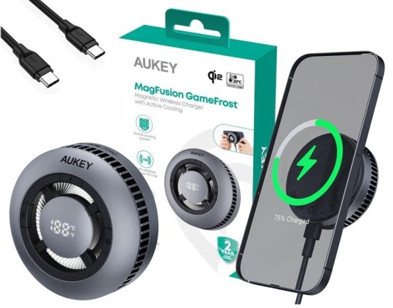 AUKEY LC-G10 MagFusion GameFrost Qi2 Ładowarka bezprzewodowa Magsafe 15W USB-C z aktywnym chłodzeniem + kabel AUKEY USB-C