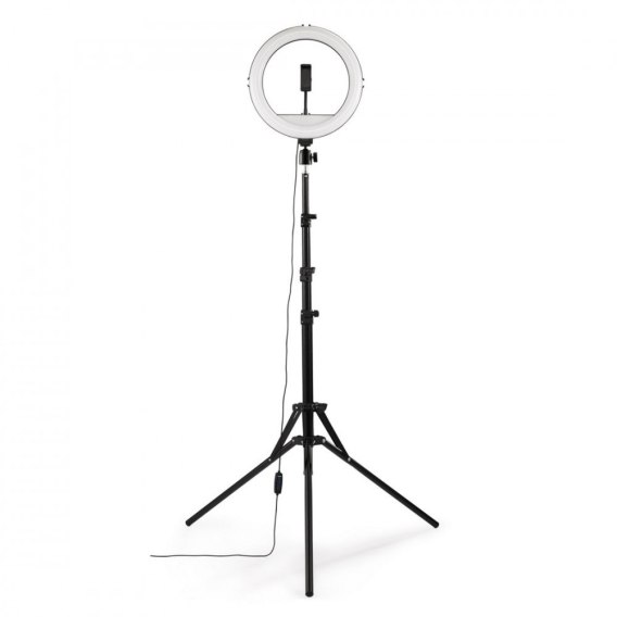 Lampa pierścieniowa na statywie, którego wysokość można regulować w trzech stopniach, aż do 215 cm, co umożliwi Ci pracę przy szerszych sceneriach. Kulowa głowica pochyla się w dowolnym kierunku. Natomiast smartfon możesz umieścić w orientacji pionowej lub poziomej.