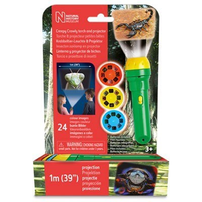 Ta poręczna latarka LED jest także projektorem fotograficznym, wyświetlającym kolorowe obrazy o szerokości do jednego metra na ścianach i sufitach. Zawiera 24 przerażające obrazy chrząszczy, karaluchów, pająków i wielu innych owadów. Latarka posiada 3 dyski slajdów z 24 kolorowymi fotografiami. Łatwo wymieniaj i zmieniaj slajdy, odciągając plastikową klapkę i wkładając wybrany dysk, a następnie obracaj dysk, aby oglądać fantastyczne kolorowe obrazy o szerokości do jednego metra. Obrazy można łatwo ustawić, obracając głowicę obiektywu. Może być również używana jako zwykła latarka bez założonych prowadnic i doskonale nadaje się do trzymania na stolikach nocnych, aby zapewnić dzieciom komfort w nocy. Mierzy 11 cm długości i około 3,5 cm średnicy w najszerszym miejscu.